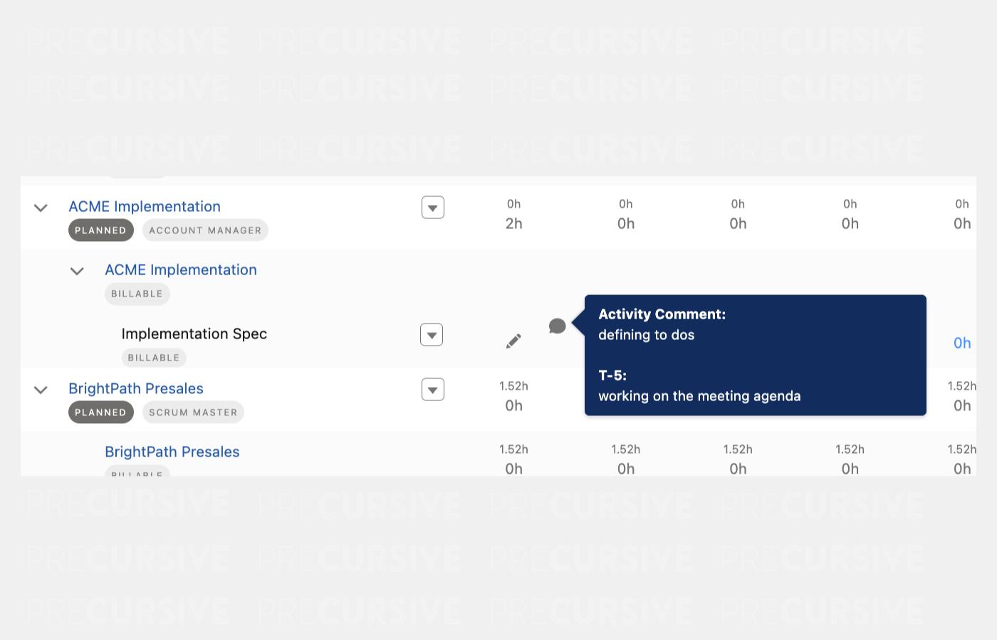 - If an Activity also has its own comment, that is shown at the top, above the Time Log comments
