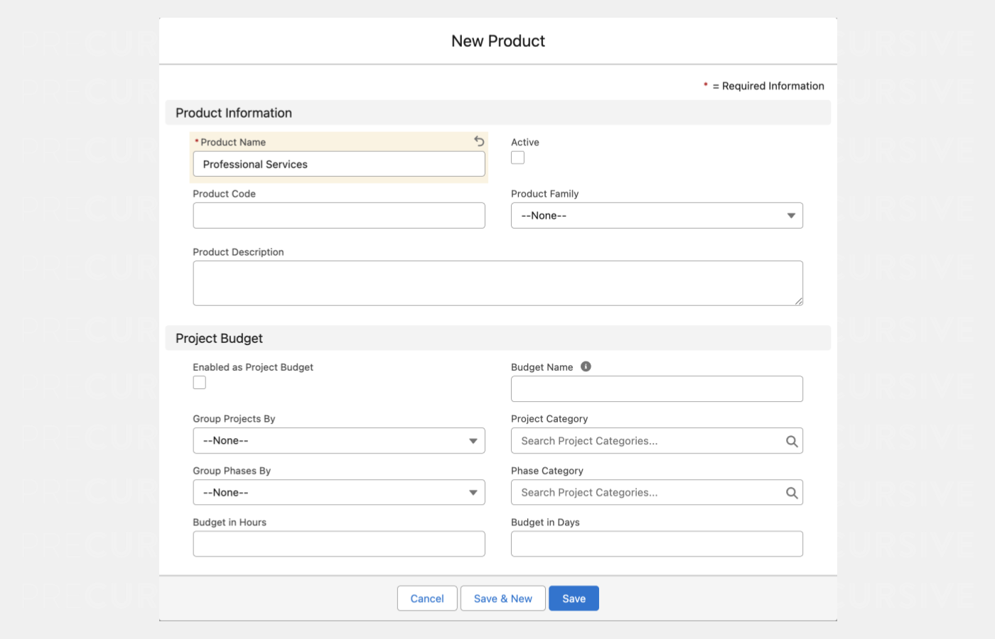 For a Budget to be created we first need to define additional information on the Salesforce Product so Precursive will treat it as a services product that will impact how the Project is created.